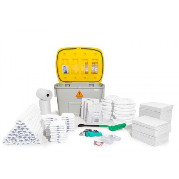 - Ta izredno velik komplet za nujne primere vsebuje vrsto različnih veziv za hitro zadrževanje in absorpcijo velikih količin tekočine, npr. v primeru puščanja iz IBC-jev,